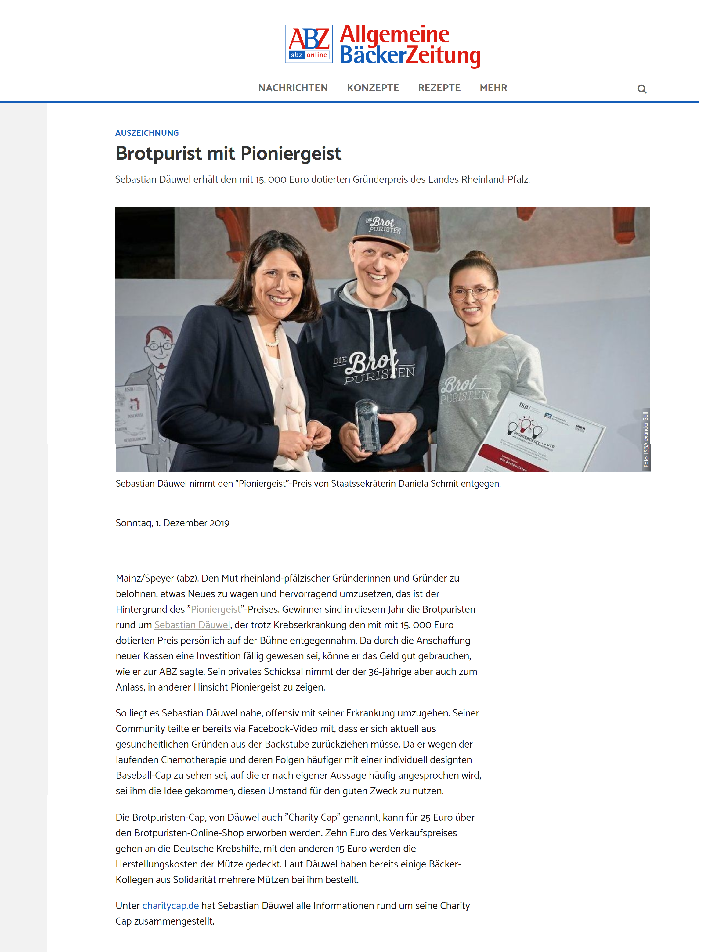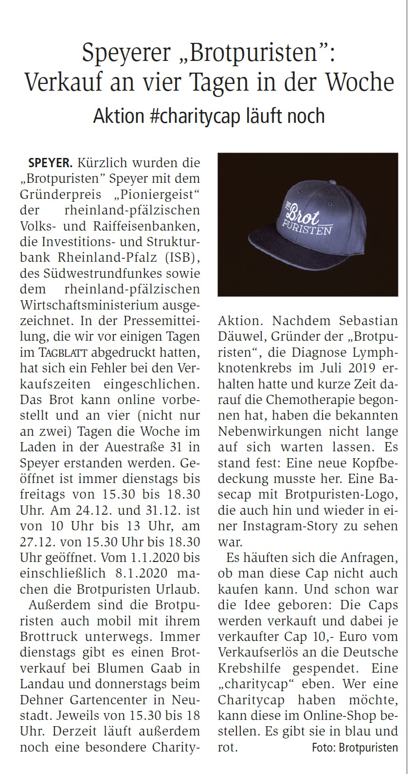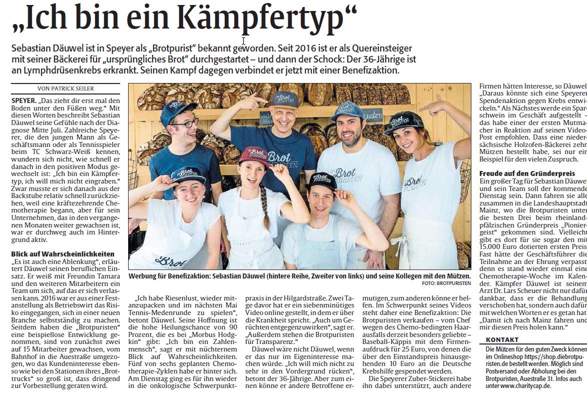 Nachdem Sebastian Däuwel, Gründer der „Brotpuristen“, die Diagnose Lymphknotenkrebs im Juli 2019 erhalten hatte und kurze Zeit darauf die Chemotherapie begonnen hat, haben die bekannten Nebenwirkungen nicht lange auf sich warten lassen. Es stand fest: Eine neue Kopfbedeckung musste her. Eine Basecap mit Brotpuristen-Logo, die auch hin und wieder in einer Instagram-Story zu sehen war. Es häuften sich die Anfragen, ob man diese Cap nicht auch kaufen kann. Und schon war die Idee geboren: Ja, die Caps werden ab sofort verkauft und dabei je verkaufter Cap 10,- EUR vom Verkaufserlös an die Deutsche Krebshilfe gespendet. Eine „charitycap“ eben. Wenn auch du deine eigene Brotpuristen-charitycap haben möchtest, dann klicke einfach auf den Link zum Onlineshop. Es gibt sie in blau und rot. Wir danken dir schon jetzt für deine Unterstützung. Denn letztlich zählt jeder Euro im Kampf gegen diese sch… Krankheit!